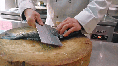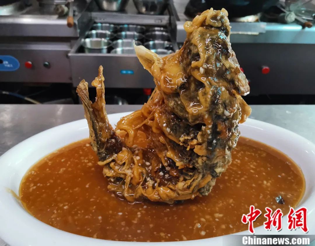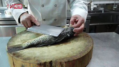 刮鱼鳞、去内脏、拔鱼线,上面打七刀,下面打八刀。“正所谓‘七上八下’,深度深至鱼脊梁骨,鲤鱼跃龙门的效果才能出来。”邓君秋一边在案板上熟练操作,一边介绍说,糖醋鲤鱼几乎是每位食客来燕喜堂的必点菜,一天至少要做六七条。