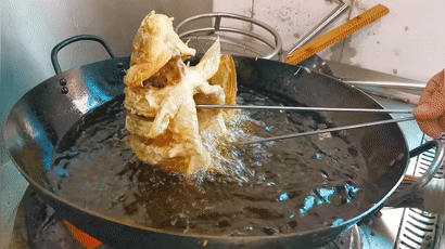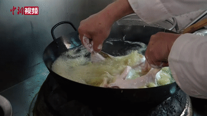 油温七成热后,邓君秋两手分别拽着鲤鱼的尾巴和肚子,让它在油锅中定型。