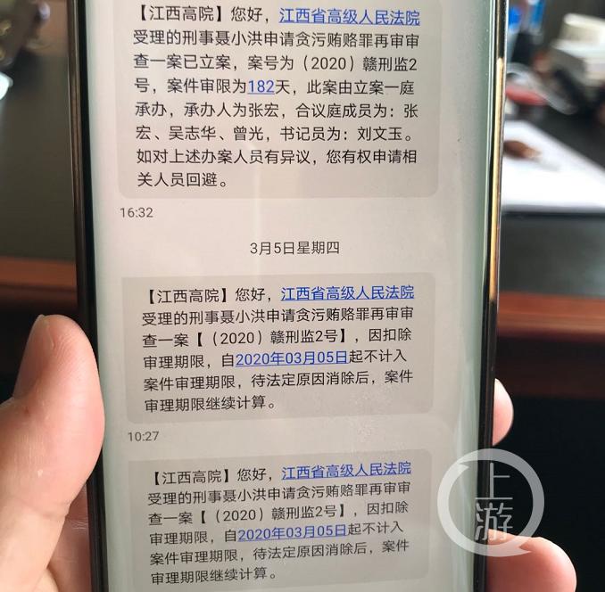 近日,聂小洪收到了江西省高院发来的立案审查通知,案由是“刑事聂小洪申请贪污贿赂罪再审审查”。