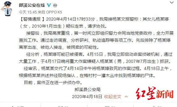 4月18日,安徽省宣城市郎溪县公安局官方微博发布一则警情通报。通报称,自4月14日接到村民杨某文的“女儿(杨某婷,2010年1月出生)疑似走丢”报案后,便全力协助查找,于4月17日晚将重大作案嫌疑人杨某某(男,2007年7月出生)抓获。经审讯,杨某某交代了4月14日中午将杨某婷致死的作案过程,并在4月18日上午现场指认杨某婷的尸体。