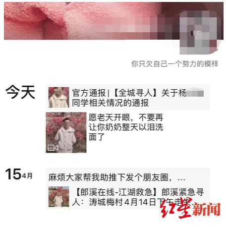 此外,在杨女士的朋友圈里,记者也看到,4月14日当意识到杨某婷不见了之后,其家人曾在村中四处寻找过,并查看了当日村里的监控录像。而据监控录像显示,4月14日中午11时17分时,身高1米3左右,扎马尾辫的杨某婷曾独自出现在村子里,当时她正穿着蓝色上衣、黑色长裤,低头打量脚边的白色小狗。