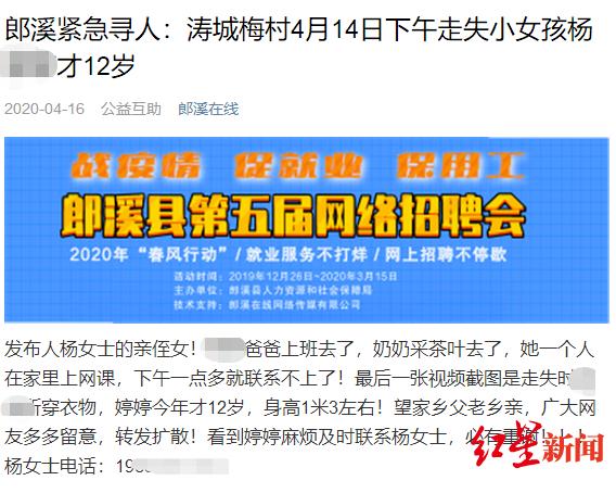 在受害人家属之前发布的寻人启事里,记者看到,一名自称是杨某婷姑姑的杨女士称,事发当日杨某婷的爸爸上班去了,其奶奶也外出采茶叶,家中仅剩杨某婷一人在上网课。