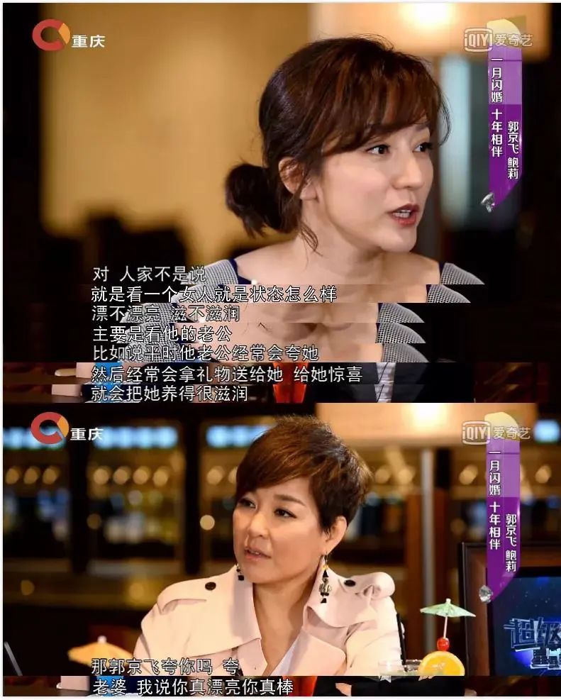 鲍莉“佛系”的陪伴支持,才把郭京飞培养成为“宠妻狂魔”,陪鲍莉逛街,只要她的目光在哪件旗袍或高跟鞋上多停留几秒,郭京飞就会买下来。当外界因为他们的闪电“裸婚”而对他们的婚姻抱有质疑时,鲍莉直言郭京飞把她养得很滋润。刚结婚时,身高166cm的鲍莉很瘦,脸色也不好,郭京飞会给她隔三岔五地煲虫草乌鸡汤,去外地拍戏,他也会将冰箱里塞满妻子钟爱的美食……