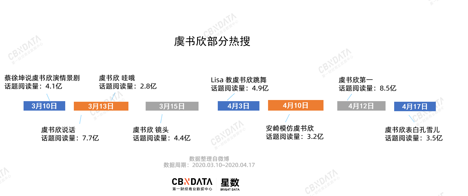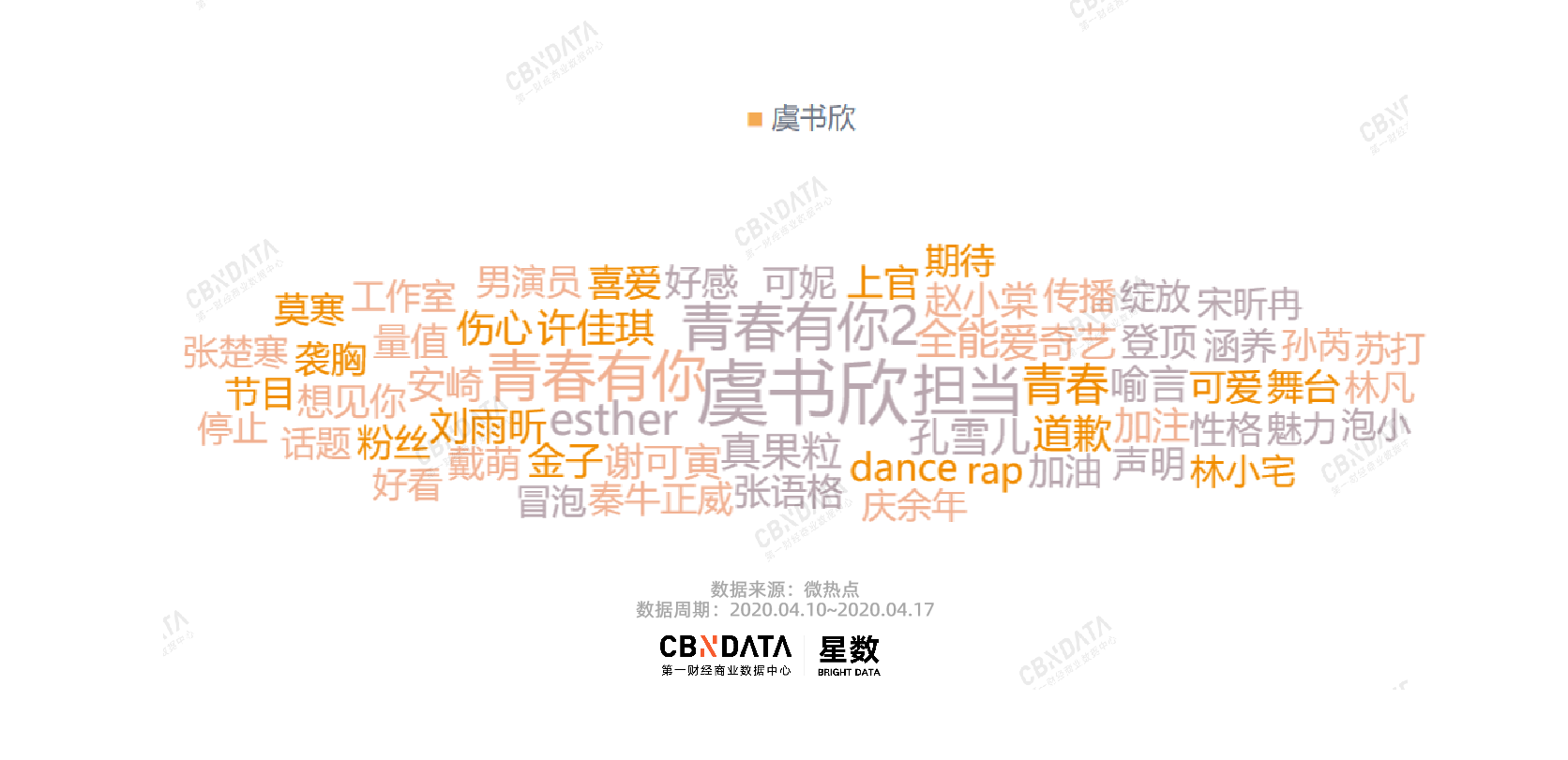 此外,根据微热点,从4月10日至17日的近一周时间内,虞书欣相关关键词中“好感”、“登顶”、“魅力”等正面评价明显占据主流。