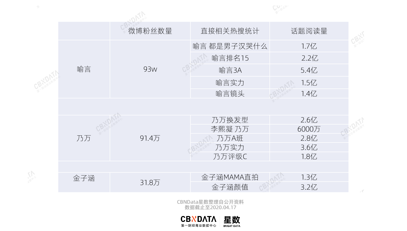 截至4月17日,喻言直接相关热搜为5个,其中话题#喻言排名15# 和 #喻言 都是男子汉哭什么#获得较多关注。前者阅读量近2.2亿,后者则为1.7亿。而乃万和金子涵相对还处在热度低位,直接相关热搜数量分别为3个和2个,和热度最盛的虞书欣相比,还有很大的差距。