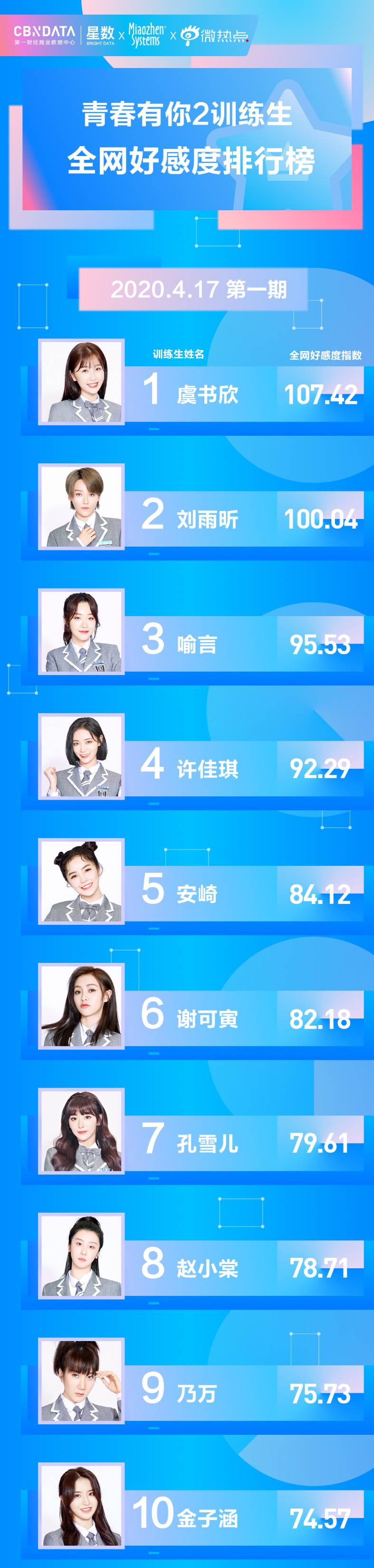 对于竞争激烈、变幻莫测的娱乐圈来说,热度来得快,去得更快。但大众好感带来的“路人缘”,却能成为长远发展的资本。因此,第一财经商业数据中心(CBNData)星数联合秒针系统及微热点发布《青春有你2》训练生全网好感度榜单,第一期榜单于4月17日正式发布。榜单基于微热点全网热度声量与秒针系统的舆情净喜好度指数,以周为测算周期,综合衡量得出的《青春有你2》训练生的好感度指数。