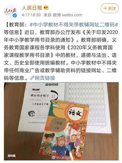 近日,教育部办公厅发布《关于印发2020年中小学教学用书目录的通知》,公布了2020年普通中小学、特殊教育学校和体育运动学校教学用书目录和用书要求。通知要求,中小学教材中不得夹带任何商业广告或教学辅助资料的链接网址、二维码等信息。