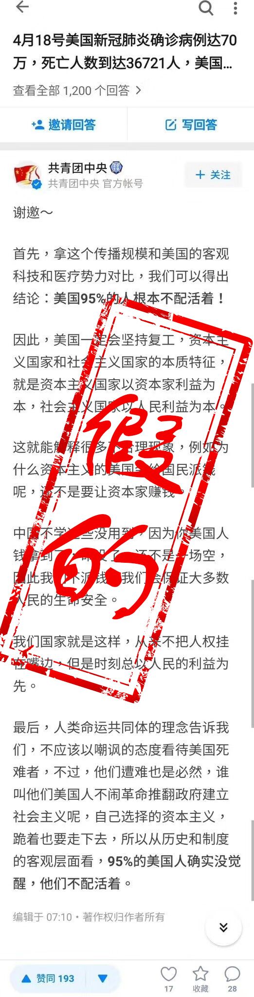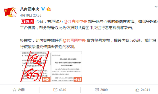 @共青团中央消息,4月19日,有声称为@共青团中央知乎账号回答的截图在微博、微信等网络平台流传,部分账号以此为依据对共青团中央进行恶意揣测和攻击。