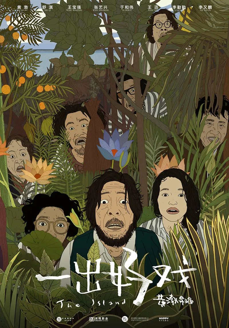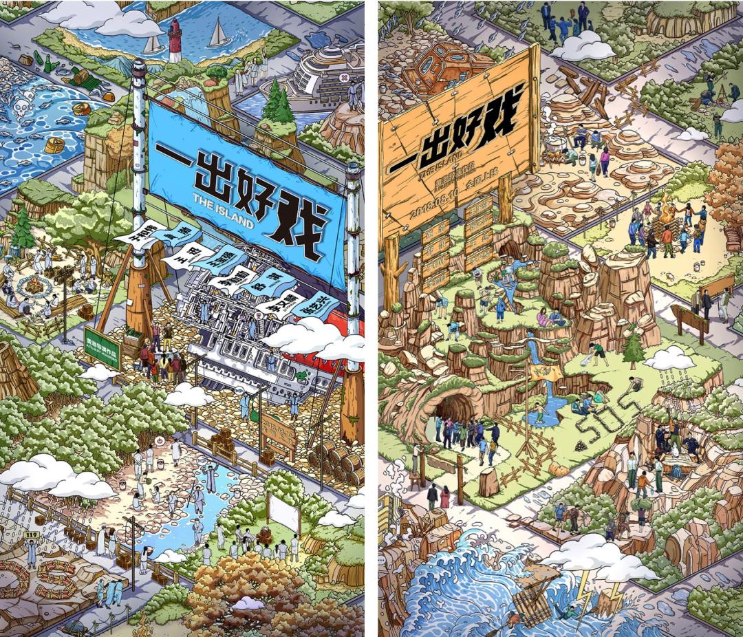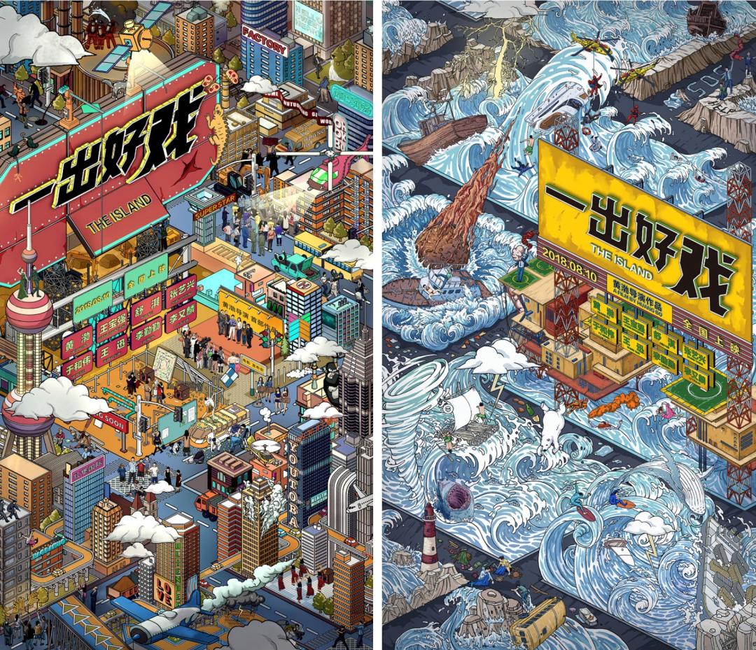 《一出好戏》这四款手绘海报分别是高楼、海洋、岛屿和树林,它们正好构成了剧情的四幕,主要情节也都能在海报中找到。