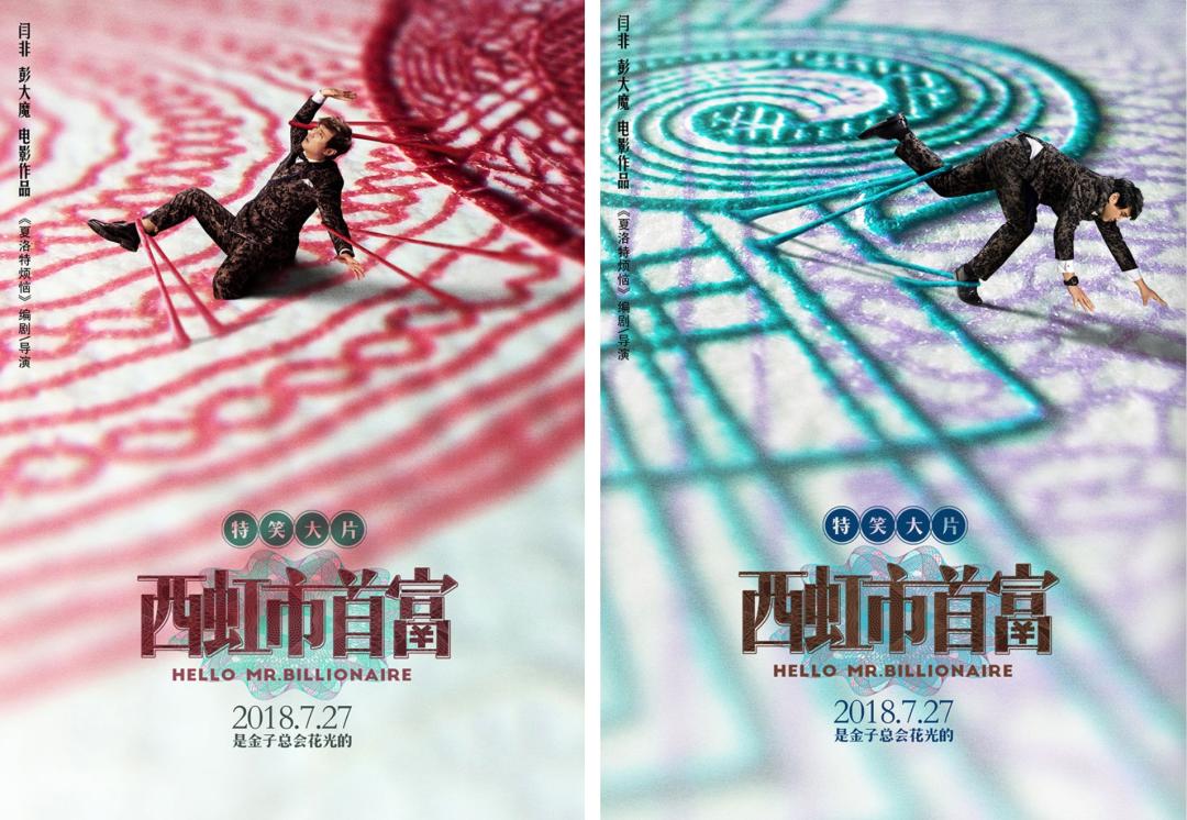 《西虹市首富》不仅翻拍自二十世纪八十年代的美国影片《布鲁斯特的百万横财》(Brewster's Millions,1985),其实这款人物情景海报的概念也是取自原片的主海报。只不过《布鲁斯特的百万横财》是主角从美钞堆里冒出来,《西虹市首富》是被人民币的纹路(壹佰圆下方的梅花)羁绊,仿佛陷入泥沼之中,迎合主角“花钱特烦恼”的主题。