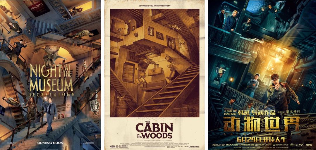 这种构图设计海报也不新鲜了,包括《博物馆奇妙夜3》(Nightatthe Museum:Secret of the Tomb,2014)、《林中小屋》(The Cabin in the Woods,2012)。不过它的质感还是上乘的,好过使用了同样概念的《动物世界》海报。