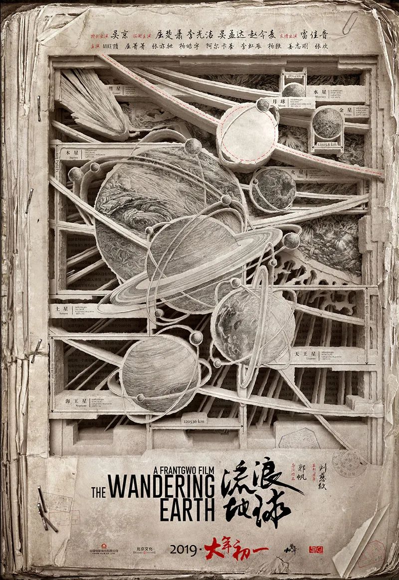 虽然《流浪地球》是2019年的影片,但这张“先导海报”是2018年推出的,设计来自固力果工作室。海报像一本镂空的已经破旧不堪的书,里面是各大行星的介绍,唯独不见地球,那地球去哪儿了呢?流浪去了吧。
