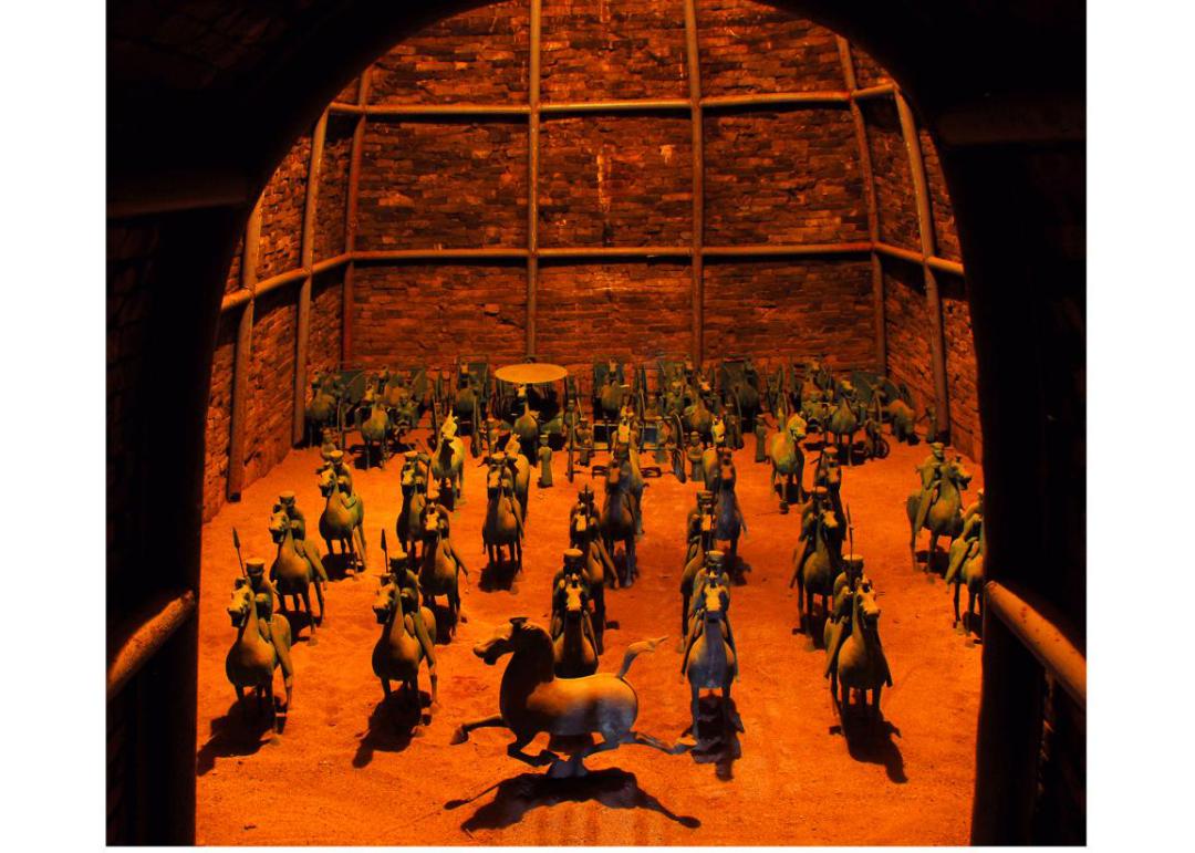 铜车马仪仗俑共99件,包括14辆铜车,39匹铜马,45个铜俑,1头铜牛。排在最前面的是17匹武士俑乘骑;后面是1匹主骑和4匹从骑;紧跟其后的是8位背刻“张氏奴”三字的奴仆;接下来是1辆斧车(马车上装有大斧)、驾马1匹,4辆轺车(古代轻便的小马车)、驾马4匹,御奴5人,从婢2人;再后面是展示主人不同身份职位的三组车马;最后面是辎重车马俑,有三辆大车和一辆牛车及驾车奴1人。铜马形态各异,车辆结构精美,人物栩栩如生,所有这些,组成了一支高级武官出行时的仪仗队伍,场面壮观,声势浩大。铜车马仪仗俑气势恢宏,制作精良,既显示了墓主人高级武官的身份,也是研究当时政治、军备、等级制的资料和依据,被史学界称为“地下千年雄狮”。仪仗俑的后方,左右各设一座钟塔,背景是描绘出征场面的大型花岗岩浮雕,与仪仗俑前呼后应,相得益彰。