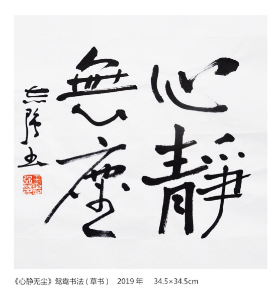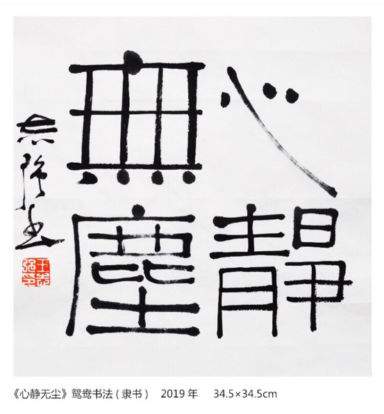 朋友在聊天时曾经这样对我说过:”在适当的时候,适当的场合你可以演示一下鸳鸯书法的创作过程,这样一来会使大家对你的鸳鸯书法创作有个更加深刻的理解,同时也会吸引更多大众的眼球。确实来说创作过程可视性极强。但我不喜欢也不随便在公共场合来进行创作演示,可能是在37年来设计生涯使我养成了一个追求更加完美的”完美主义”者,说白了就是养成了一种职业病吧。但也不排除平时自己练的少、创作的少,功夫还不够,沒有熟练到随时随地可以展示给观众的地步。书法创作是一件很严肃的事情。需要认真对待,我想只有不断提高自已的审美能力,练好内功,才能创作出更多更好的鸳鸯书法作品来。一个人的眼光(审美)高了,手才能高。(这里指“手才能高”前提是:要通过平时认真、刻苦、持之以恒的学习、练习),否则眼不高,手不可能高。审美需要长年的艺术积淀和技朮的积累,不能急于求成。尽量在现有的水平和能力之内以负责任的态度来对待自已的作品创作。