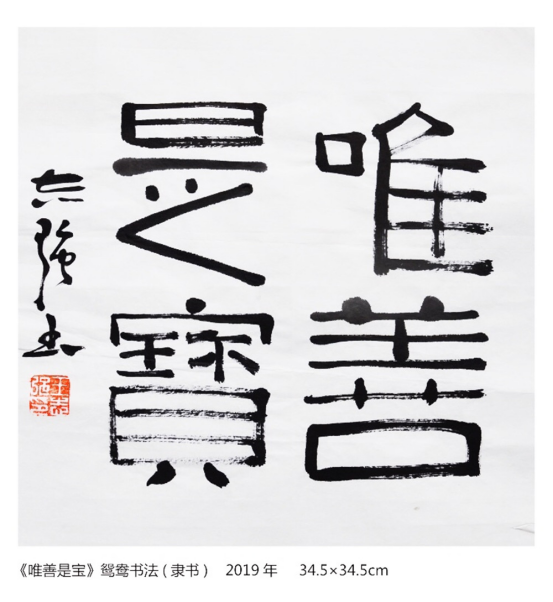 继承要创新,创新才能发展。一味强调继承,不求创新,有句话是怎么来着”那就是躺在前人的功劳簿上睡大觉”。一谈到创新就色变、到了禁区、有多少个理由。好!请问创新到底该到什么火候、时间才能够创新?具备怎样的条件才能够创新?既然书法选择了宣纸,我的回答是:它(鸳鸯书法)随其了自然、自然中的必然的创新才是美的。