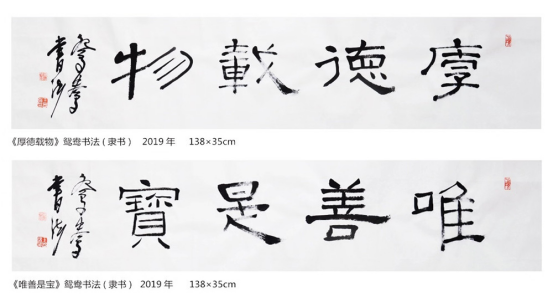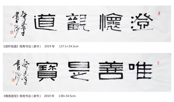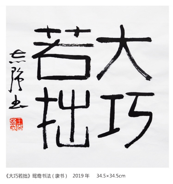 木雕能”正反两面雕出不同的图案,出现不同的题材,这就需要艺匠有高超的智慧和巧妙的构思。”姐妹艺术之间有着惊人的巧合与相似之处。鸳鸯书法创作正反两面不同的字句内容与木雕双面雕、苏绣双面绣高度契合。同时也说明艺术顺应自然发展方向最终是高度的一致。