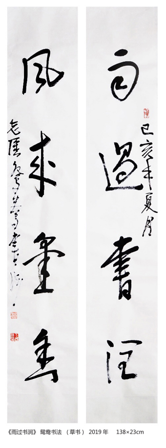 书法作品最终要借笔、墨、纸来充分体现书法的艺术魅力,而鸳鸯书法的创作把纸的特性和墨的韵味发挥到了极致,鸳鸯书法创作打破了中国书法固守几千年来一直不变的创作形式,同时也遵循了自然界发展这一规律。