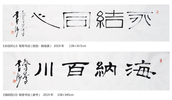 写到此想起了中国收藏研究院信函中的一段话:“在很多情况下,所谓高手与庸手之别,仅在于一层未曾捅破的窗户纸,就一般书画家而言,经过一定时期的艰苦训练,师古人,师造成,在笔墨,布局等方面的技法性问题皆能得到解决,而后之所以有高下之别,在于深思,在于敏悟也,而这种精思敏悟的基础,则是读书万卷,废画三千。笔墨技巧是可以通过时间练就的,像您这样用心去创作,把艺术当作生命的艺术家不是用时间可以练就的,这就是您的作品常人所不能达到的原因”。[1]过奖了,受之有愧。其实就是一个目的,创新。创新不是有手不用手,非得用鼻子、嘴巴、脚来写字,抖来抖去,颤颤巍巍,用时下流行的一句话来说,就是感觉进入了“书法界”的“帕金森专场”。书法作品创新的前题是要给人们带来一种美的享受。
