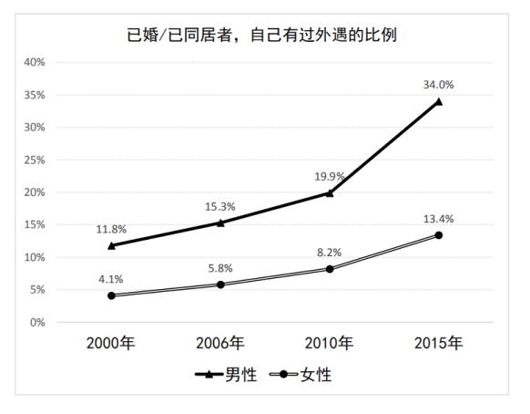 在性学家潘绥铭教授的主持下,中国人民大学性社会学研究所在2000年、2006年、2010年、2015年,四次对中国人的性行为、性观念、性关系进行了全国总人口的随机抽样调查,其中就包含了婚外性行为的详细数据。
