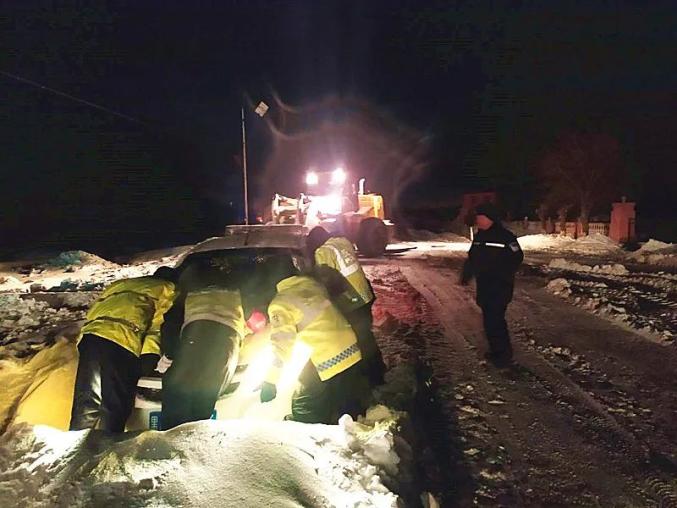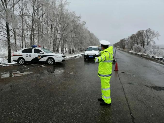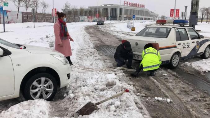 龙江县公安局交警大队民警、辅警在岗地对车辆车辆进行疏导的同时,帮助多辆因积雪原因发生车轮打滑的车辆进行救助、推行,将困在雪中的车辆推至安全车道。