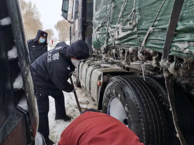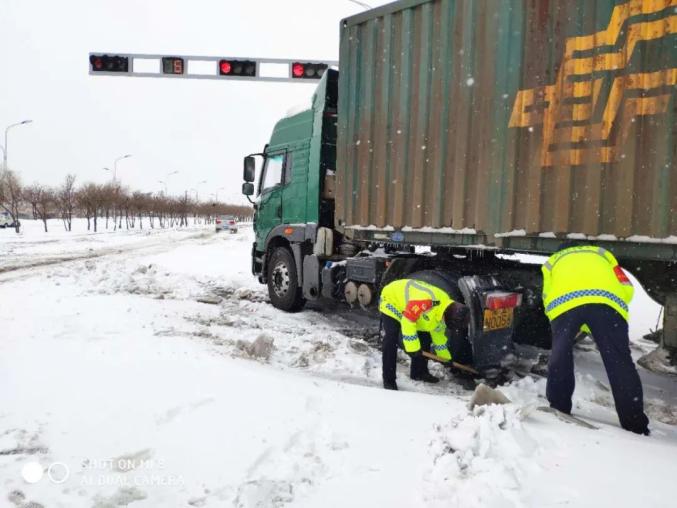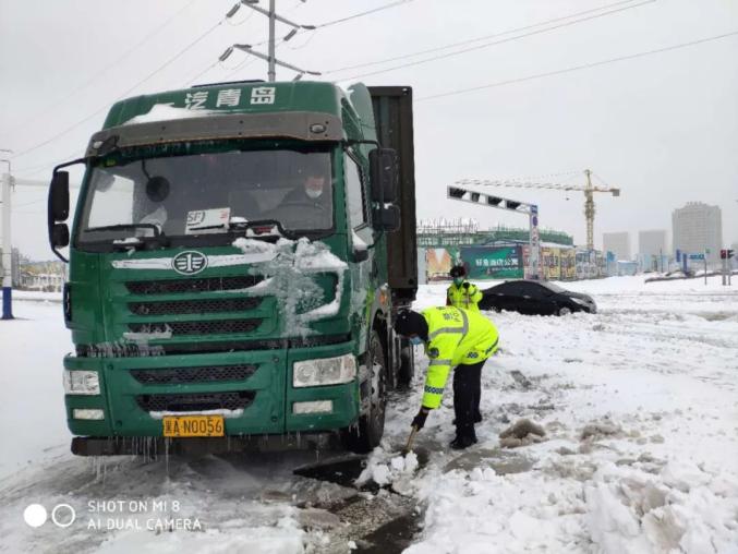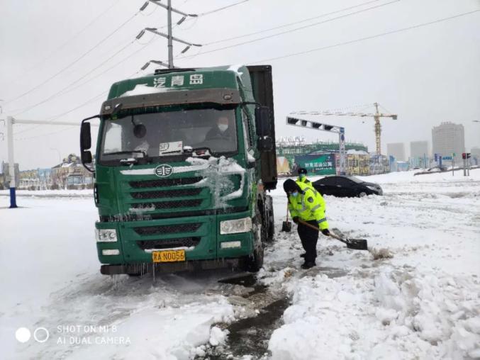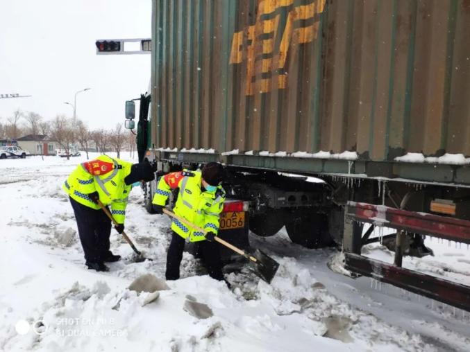 铁锋交警大队民警、辅警在海河路卡点附近执勤时,发现一辆大货车因雪天路滑停在岗地中间。执勤民警、辅警发现后急时借来铁锹,帮助大货车清理车轮底部积雪,从而大货车恢复了正常行驶赢得了过往群众及车主的赞扬。