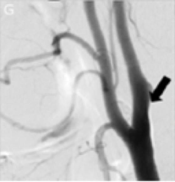 4周后患者拟进一步行颈动脉支架置入术。然而,术中进行的诊断性血管造影显示:颈动脉夹层几乎完全消失,未见明显的官腔狭窄以及内膜瓣(图1G)。右侧颈动脉球水平可见呈喙状的一个微小突起(图1G),可能是此前夹层的残留。因此,该患者最终未行支架置入。三维旋转血管造影显示AMCA双支完全再通(图1H)。3个月后随访,该患者的改良Rankin评分为0分。
