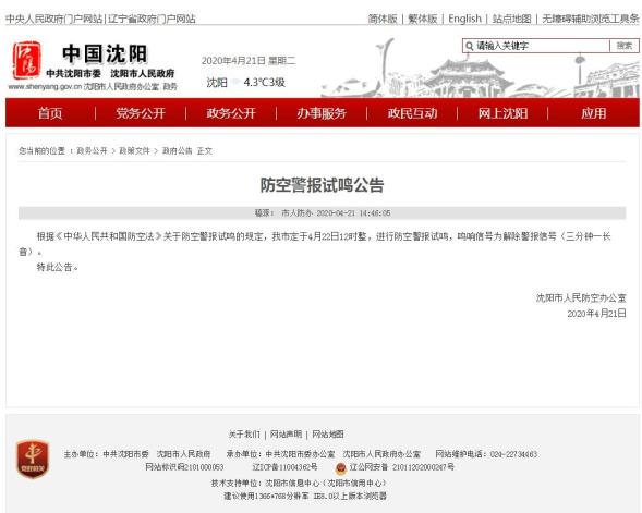 根据《中华人民共和国防空法》关于防空警报试鸣的规定,我市定于4月22日12时整,进行防空警报试鸣,鸣响信号为解除警报信号(三分钟一长音)。