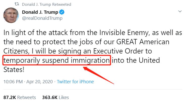 川普说,因为近期受疫情影响,美国失业人数突破2200万人,这项命令将“帮助失业的美国人在就业市场上获得优先机会”。并补充说,“暂停移民还将有助于为美国公民节省重要的医疗资源。”
