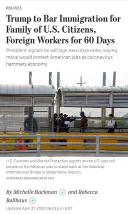 川普的批评者和支持移民的组织表示,川普政府正在借用冠状病毒危机甩锅自己应对不当的责任,并携带私货实行长期以来限制移民的意图。