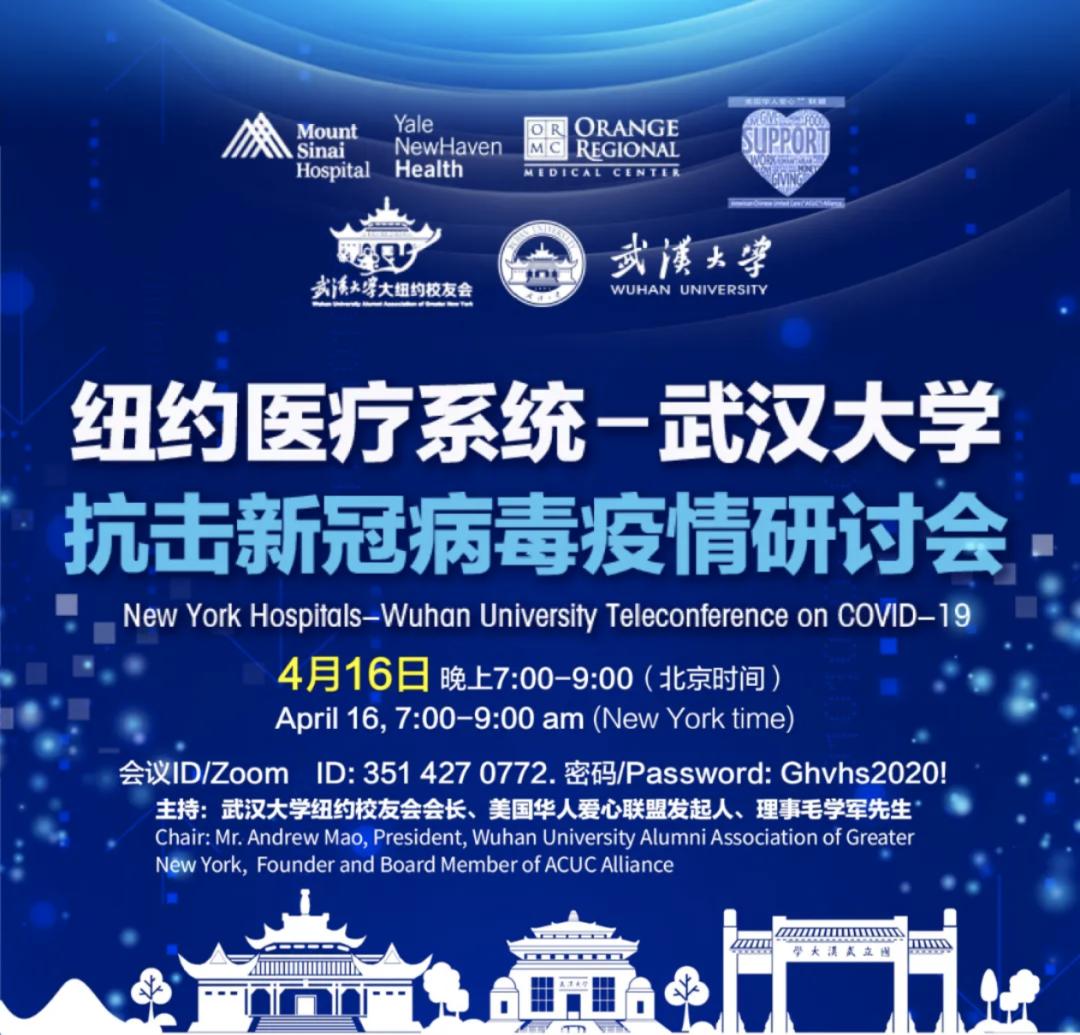 4月16日晚,武汉大学、武汉大学大纽约地区校友会、美国华人爱心联盟(ACUC)联合举办的“大纽约地区医疗系统抗击新冠病毒疫情医院管理及治疗方法研讨会”通过网络视频系统顺利举行。