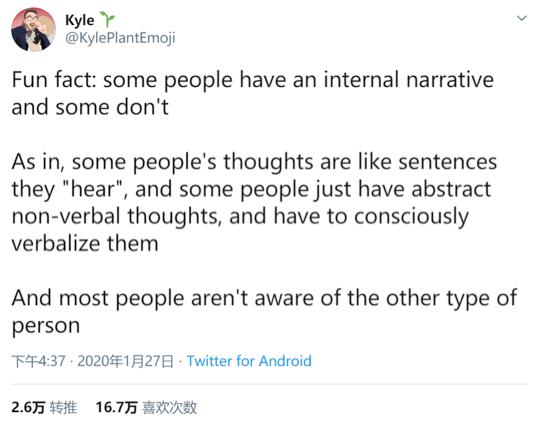 接下来,不少媒体纷纷以“当人们发现有些人没有内心独白时,整个儿震惊了”、“有些人不跟自己说话,他们过得更好吗?”之类的标题,报道这条病毒推文在社交媒体上带来的议论。