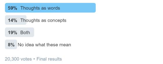 然而在Kyle那条推文下面的讨论中,有人做了一个投票,居然有高达59%的人认为自己是用语句来思考的。这到底怎么回事!