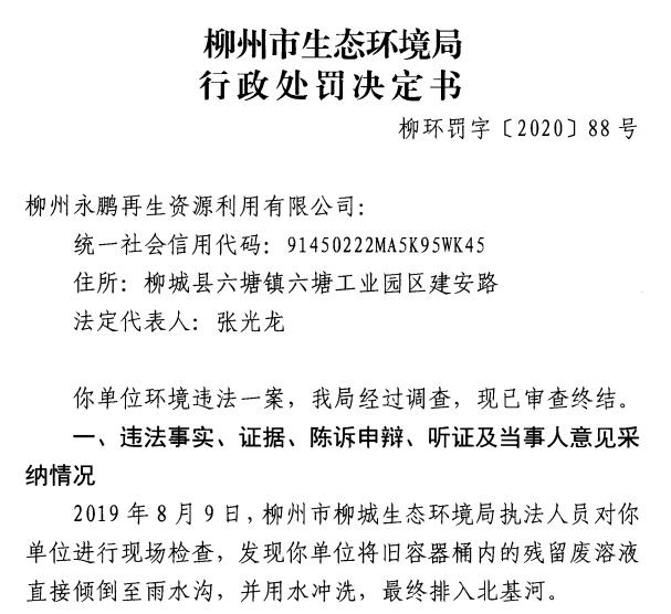 2019年8月9日,柳州市柳城生态环境局执法人员现场检查柳州永鹏再生资源利用有限公司,发现该单位将旧容器桶内的残留废溶液直接倾倒至雨水沟,并用水冲洗,最终排入北基河。