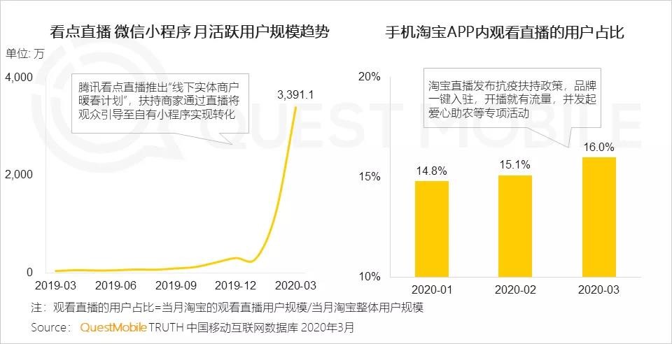 QM2020中国移动互联网春季大报告也佐证了这点:各平台在疫情期间不断走向台前,发起各种支持复工助产的活动,扶持商家通过直播电商创造新的流量来源。