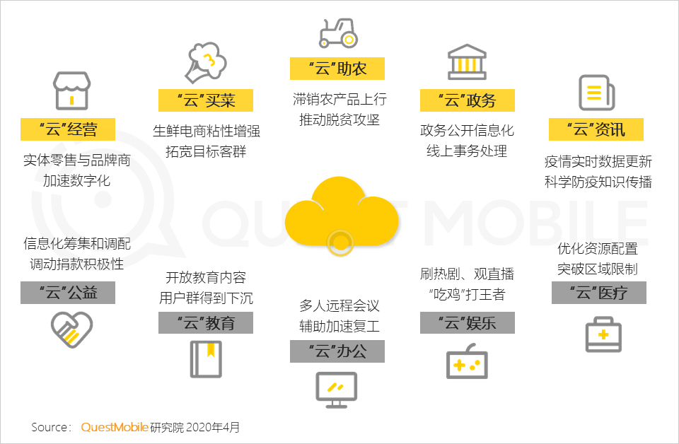 在这背后,是疫情之下的移动互联网流量的新一轮重构与用户习惯正在发生新一轮线上化转移——根据QuestMobile2020中国移动互联网春季报告指出,受疫情影响,娱乐、教育、办公、公益、医疗、经营、生活、脱贫、政务、资讯,无不快速线上化,移动互联网同比增速反弹至1.5%,月活跃用户规模较2019年末增长1700万。