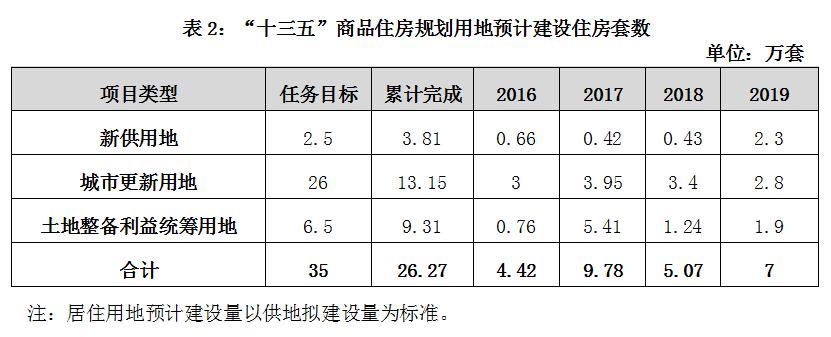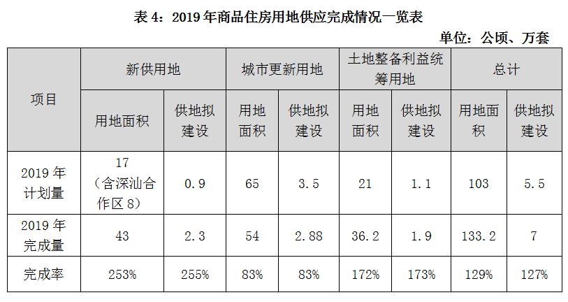 2016-2019年底,累计供地拟建设商品住房26.27万套,完成“十三五”规划指标75%,其中新供用地建设3.81万套、城市更新建设13.15万套、土地整备利益统筹建设9.31万套。