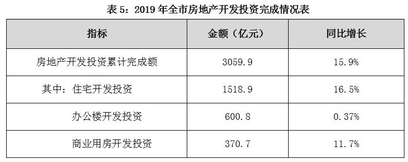 2019年,全市房地产开发投资累计完成额为3059.9亿元,同比增长15.9%,其中,住宅开发投资累计完成额1518.9亿元,同比增长16.5%。