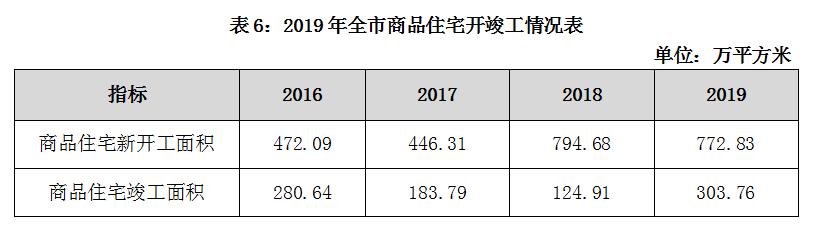2019年,全市商品住宅新开工772.83万平方米,竣工303.76万平方米。