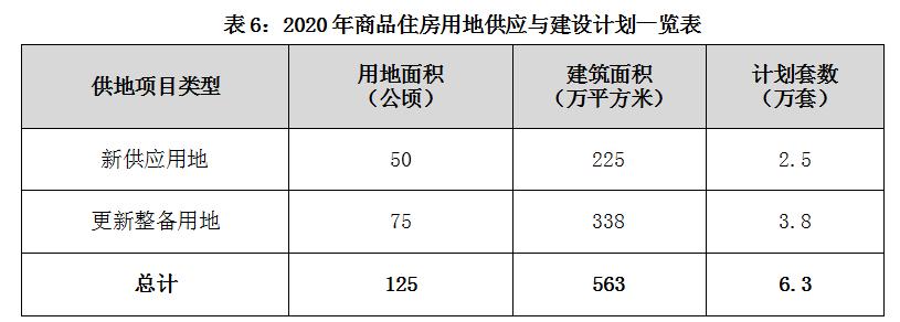 2020年商品住房计划安排用地125公顷、建筑面积约563万平方米,计划供地拟建设6.3万套。