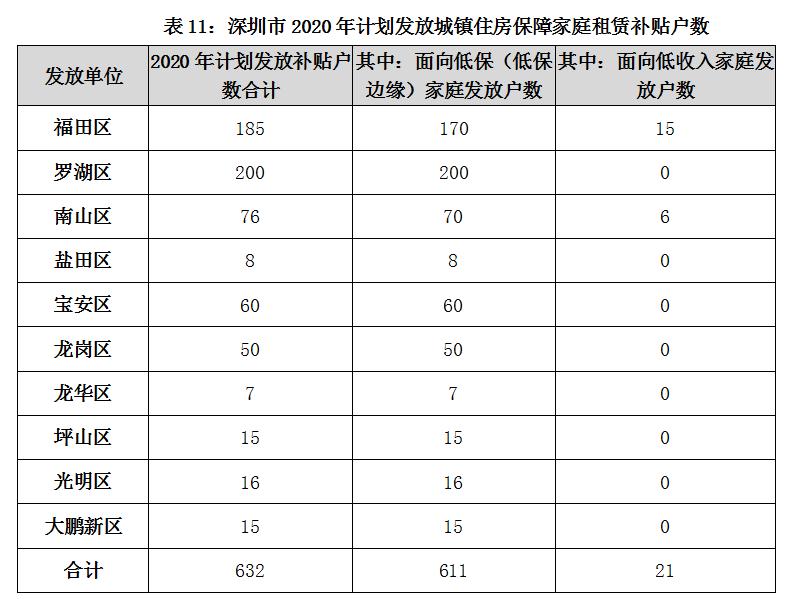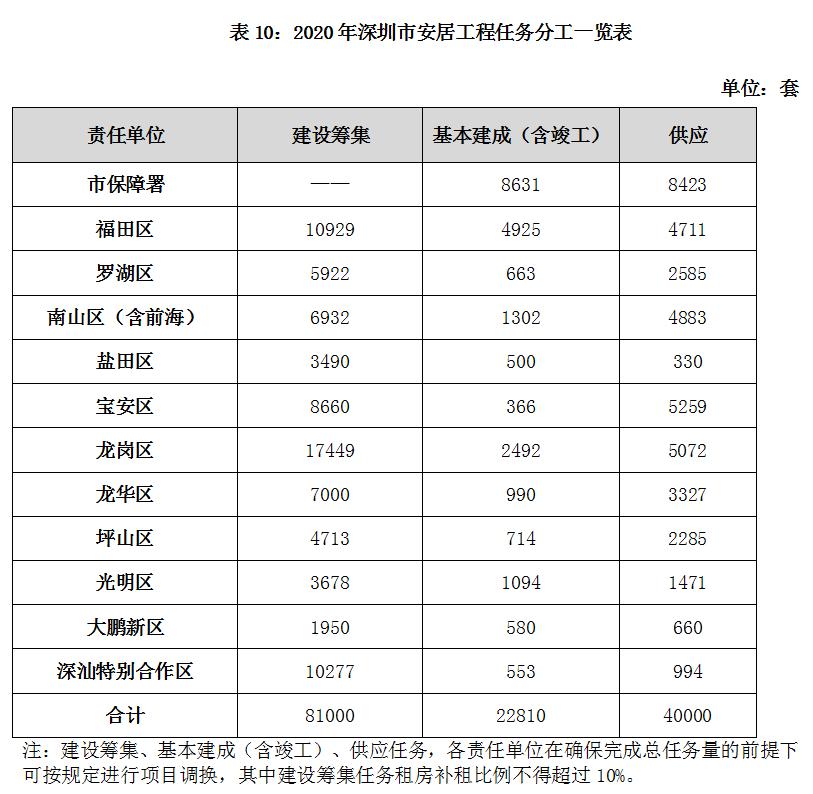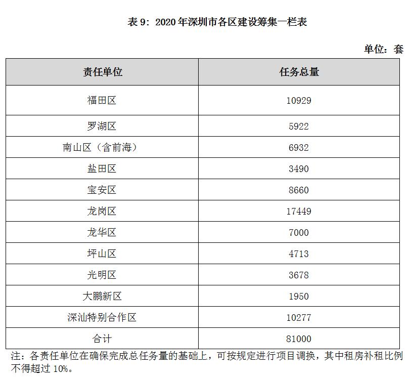 按责任单位划分,福田区计划建设筹集1.09万套,罗湖区0.59万套,南山区(含前海)0.69万套,盐田区0.35万套,宝安区0.87万套,龙岗区1.74万套(含2019年结转3757套),龙华区0.70万套,坪山区0.47万套,光明区0.37万套,大鹏新区0.20万套,深汕特别合作区1.03万套。