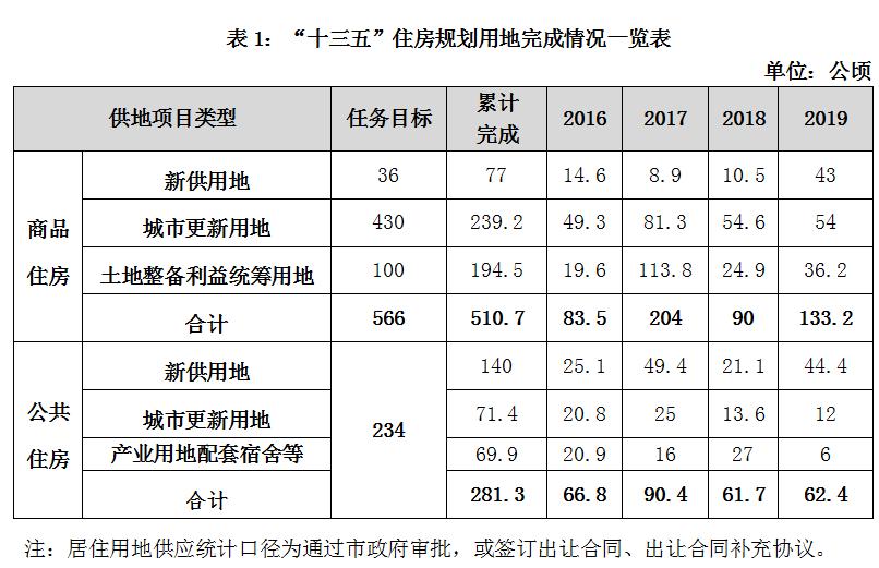 2016-2019年底,商品住房用地累计供应510.7公顷,完成“十三五”规划目标的90%;公共住房用地累计供应281.3公顷,完成“十三五”规划目标的120%,土地供应进度总体较好。