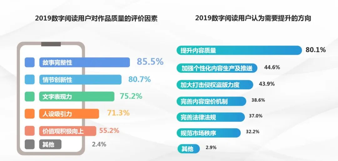 截至2019年,我国数字阅读用户总量达到4.7亿,人均电子书年接触率达14.6本,每周阅读三次及以上的用户占比达88.0%。立体多样的现实主义题材更受用户欢迎,都市职场、青春校园、历史军事类网络原创内容受到热捧。