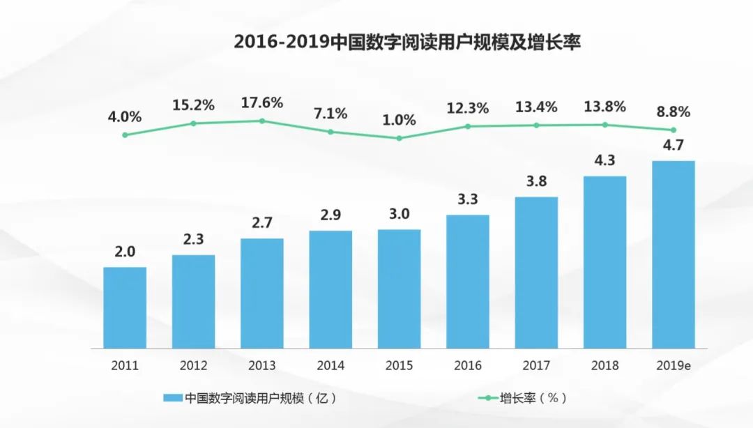 2019年,中国数字阅读整体市场规模已达到288.8亿,同比增长13.5%,其中大众阅读市场规模占比逾95%,是产业发展主导力量。