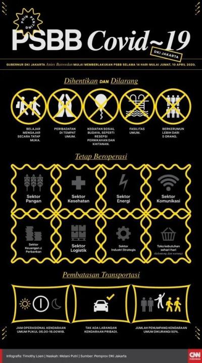 如雅加达,从4月10日起开始执行为期两周的“大规模社会限制令”,在限制令生效的14天内,仅有部分机构和企业被允许继续运营,其他机构必须让员工远程工作,并号召市民闭门不出,出门必须佩戴口罩。违规者将根据《2018年健康防疫法》处以罚款和监禁。