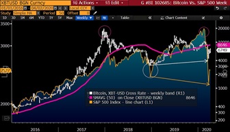 比特币和黄金价格在金融市场震荡后都很快复苏。如下图,2020 年比特币跌幅保持在了 2018 年低点上方,而该低点距离价格峰值大约有 80% 的价差。相比之下,过去一个多月以来,标普 500 指数自创下历史高点之后已跌破两年前的价格底部。新冠病毒疫情对全球市场的破坏类似于 2008-2009 和 2000-2002 年时的金融危机,但持续时间和影响程度却大得多。