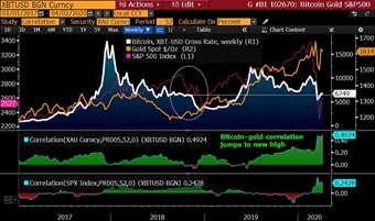 比特币和黄金关联度有所上升,因为当标普 500 指数迅速下降时,人们就会转移到其他风险资产上,所以比特币价格基础可能会得到进一步巩固,而比特币与黄金关联度也会有所增长。如下图比特币与黄金之间 52 周关联度走势图所示,当前比特币与黄金关联度创下自 2010 年以来最高水平。比特币与黄金关联度是比特币与股票关联度的两倍,过去比特币是一种投机升值手段,现在已经转型成为类似于黄金的价值存储机制,成熟度也得到进一步提升。
