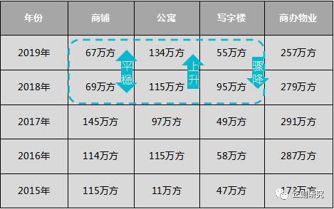 通过对比近五年的各类商办物业成交数据发现,近2年来商铺市场成交量较前三年急剧下滑,公寓市场成交相对活跃,写字楼市场成交量迅速下滑。