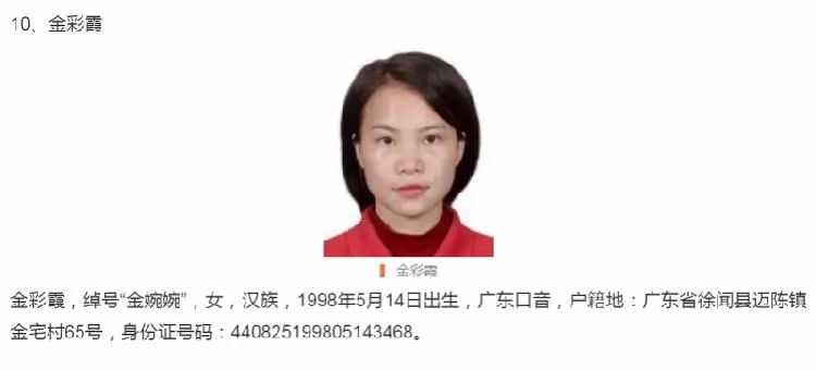 据了解,金彩霞,绰号“金婉婉”,女,汉族,1998年5月14日出生,广东口音,户籍地:广东省徐闻县迈陈镇金宅村65号,身份证号码:440825199805143468。记者了解到,金彩霞是此次公安部A级通缉令13名在逃人员中最年轻的一名。