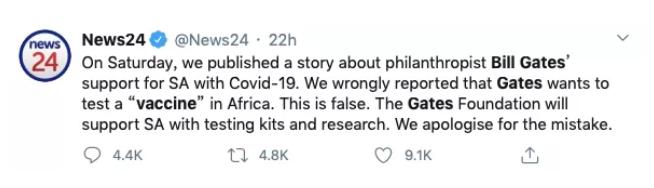 比如美国媒体“24小时新闻”曾经跟风报道“比尔·盖茨企图在非洲儿童身上做疫苗实验”,后来却急忙出来澄清:对不起,这是假新闻;