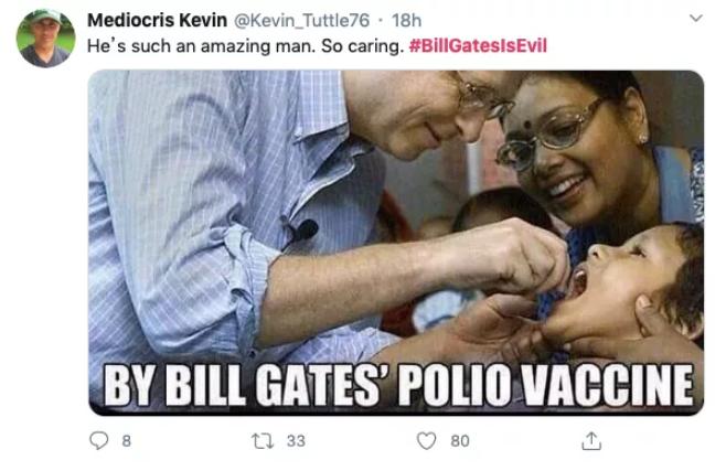比如比尔·盖茨亲自强制第三世界儿童服用疫苗,后来被证实:这是一张被恶搞的假图;